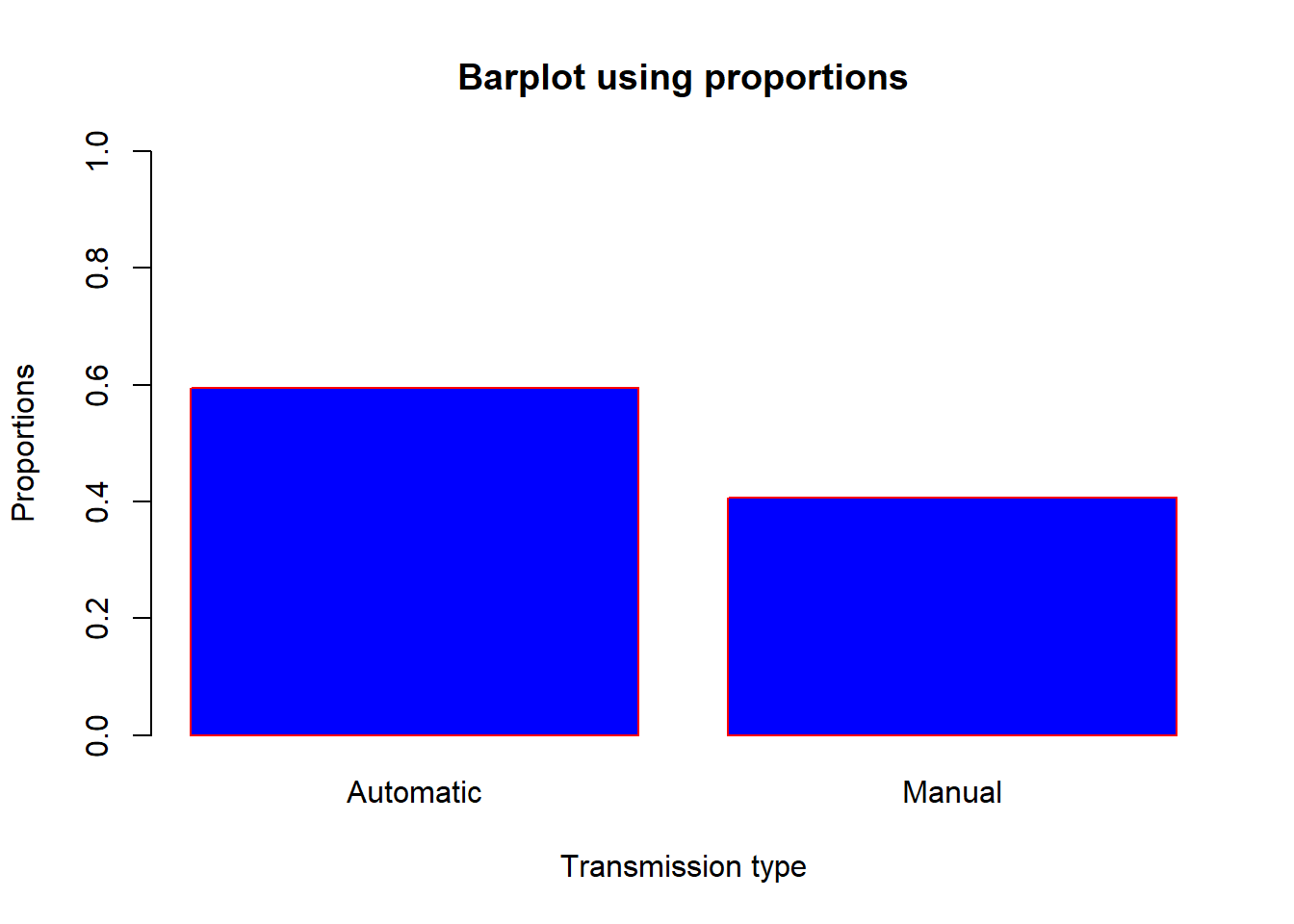 barplot(prop, main = "Barplot using proportions", xlab = "Transmission type", ylab= "Proportions", col = "blue", border ="red", ylim = c(0,1), names.arg = c("Automatic", "Manual"))
