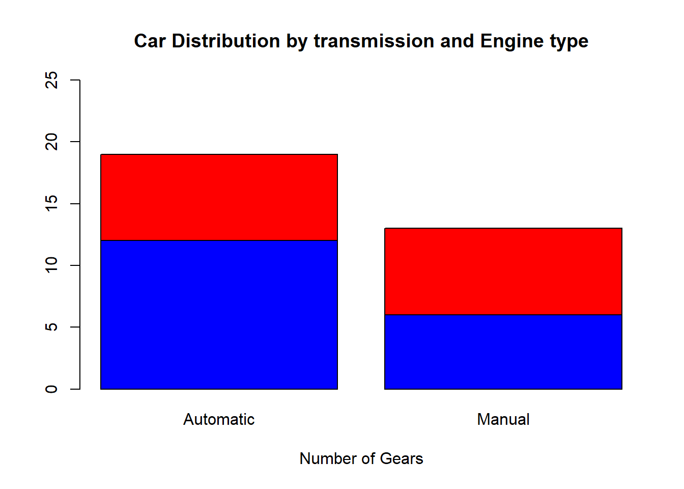xlab="Number of Gears", col=c("blue","red"), ylim = c(0,25), names.arg = c("Automatic", "Manual"))