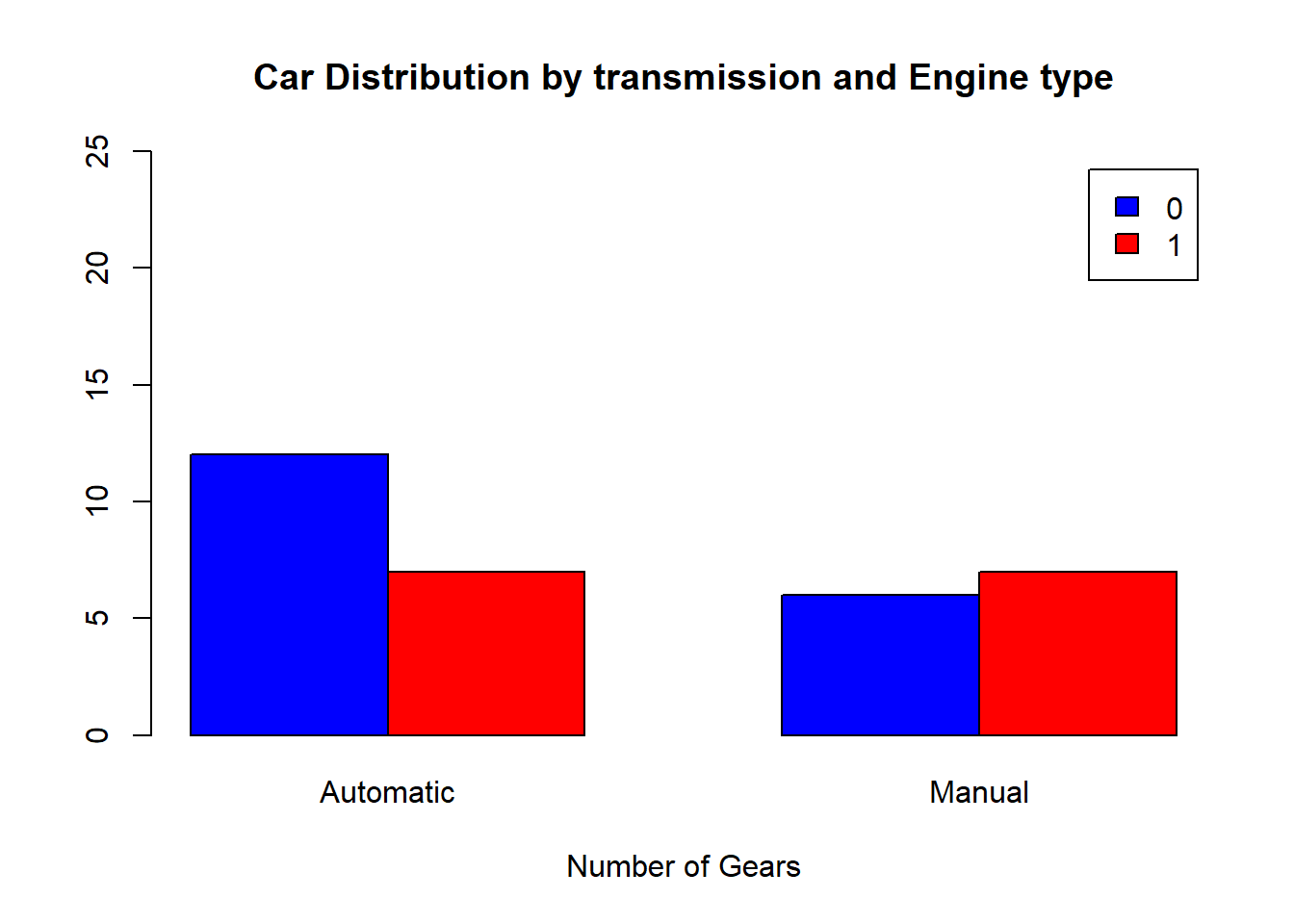 xlab="Number of Gears", col=c("blue","red"), ylim = c(0,25), names.arg = c("Automatic", "Manual"),legend = rownames(counts1), beside=TRUE)