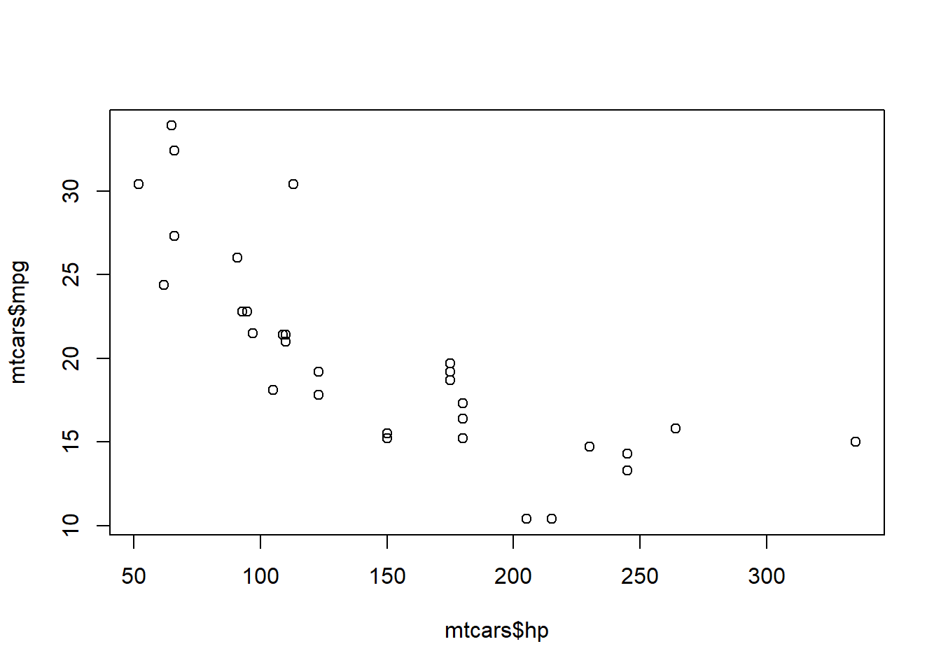 plot(mtcars$mpg ~ mtcars$hp)