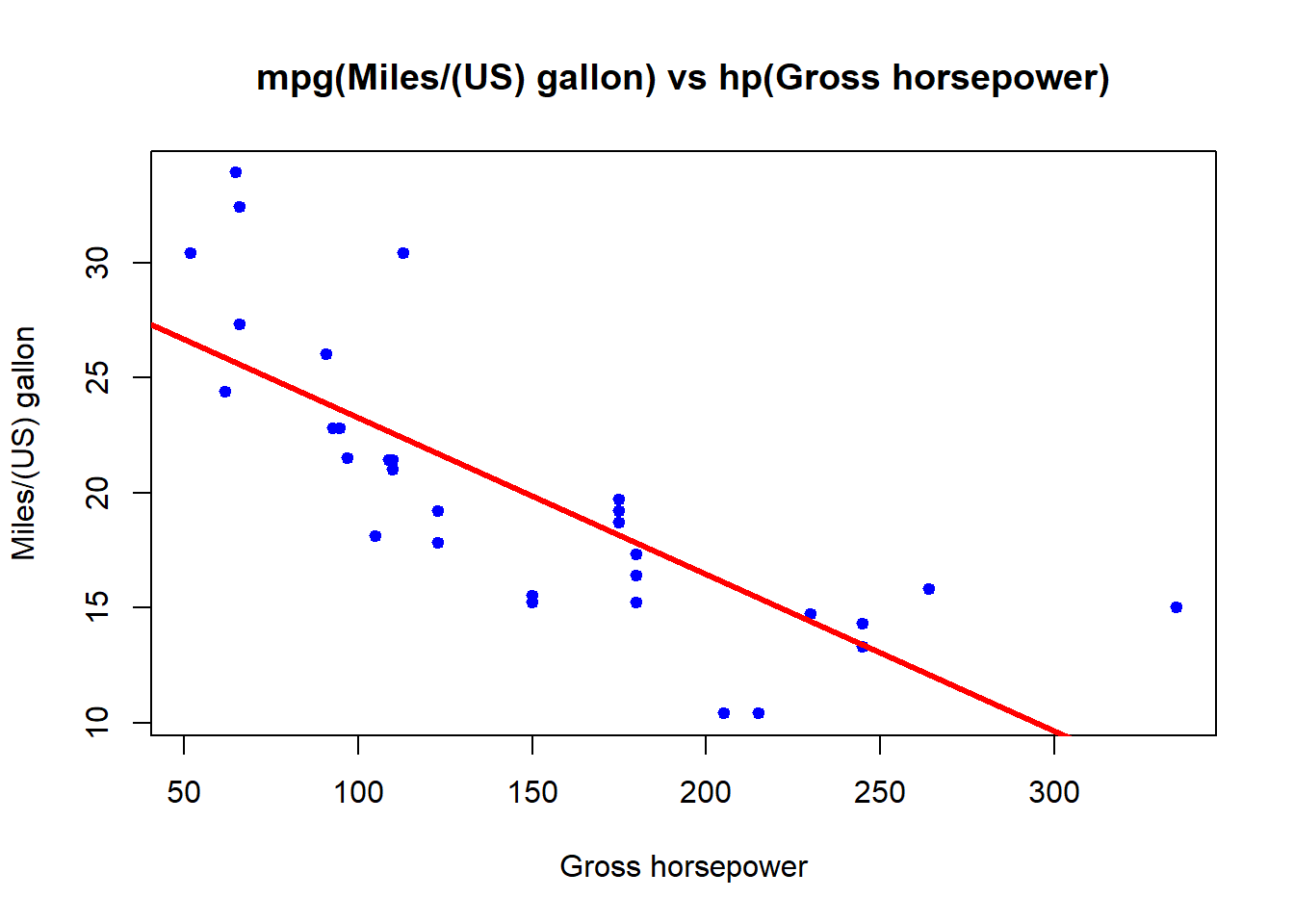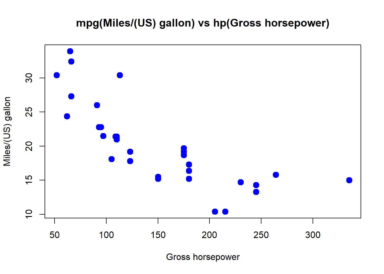 plot(mtcars$hp, mtcars$mpg, main ="mpg(Miles/(US) gallon) vs hp(Gross horsepower)", xlab ="Gross horsepower", ylab = "Miles/(US) gallon", col = "blue", pch =20, lwd=2)
