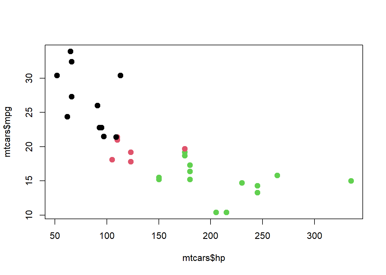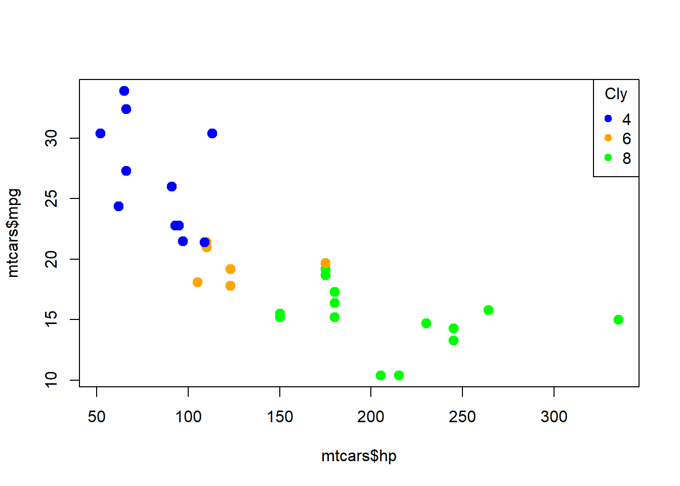 plot(mtcars$hp, mtcars$mpg, col=colors[factor(mtcars$cyl)], pch =20, cex=2)