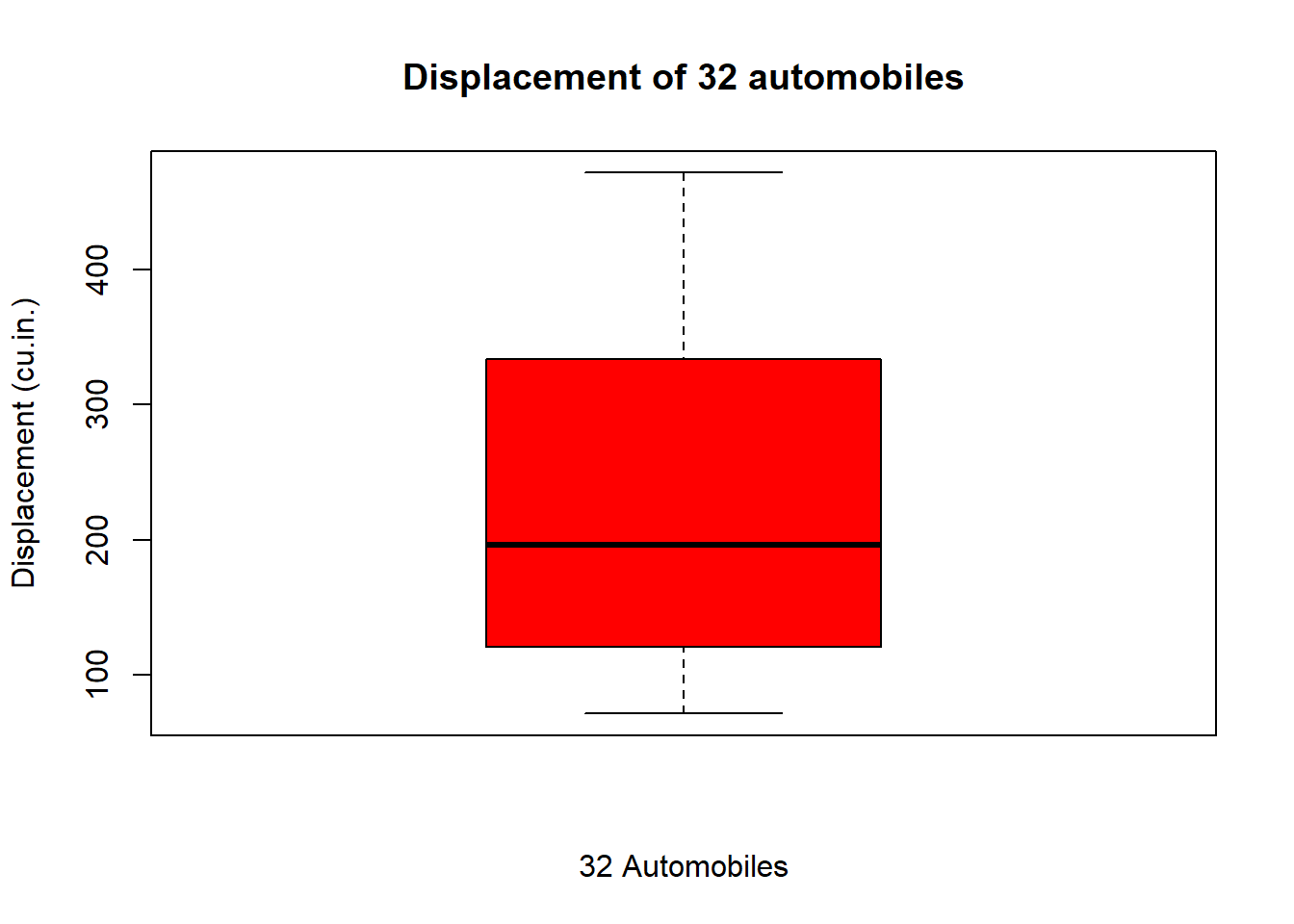 boxplot(mtcars$disp,main="Displacement of 32 automobiles", xlab ="32 Automobiles", ylab ="Displacement (cu.in.)", col="red")