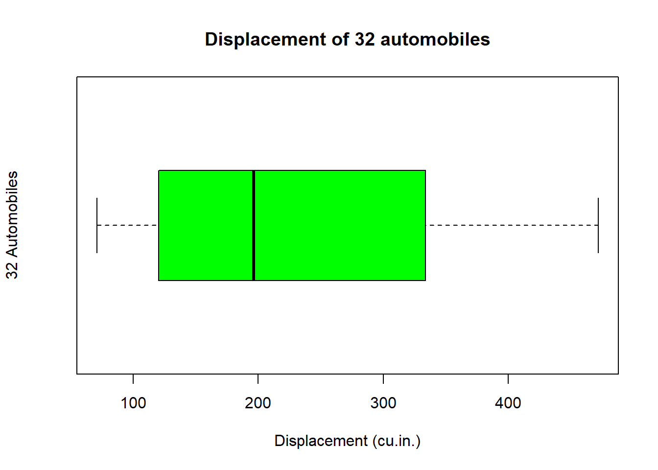 boxplot(mtcars$disp,main="Displacement of 32 automobiles", ylab ="32 Automobiles", xlab ="Displacement (cu.in.)", col="green", horizontal = TRUE)