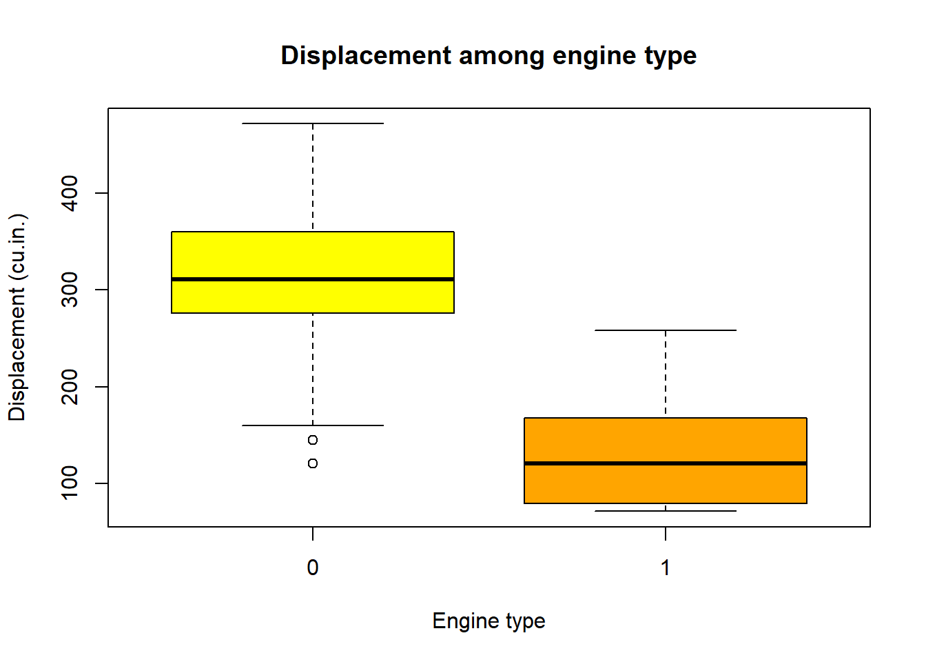 boxplot(mtcars$disp~mtcars$vs, main="Displacement among engine type", xlab = "Engine type", ylab ="Displacement (cu.in.)", col=c("yellow","orange"))
