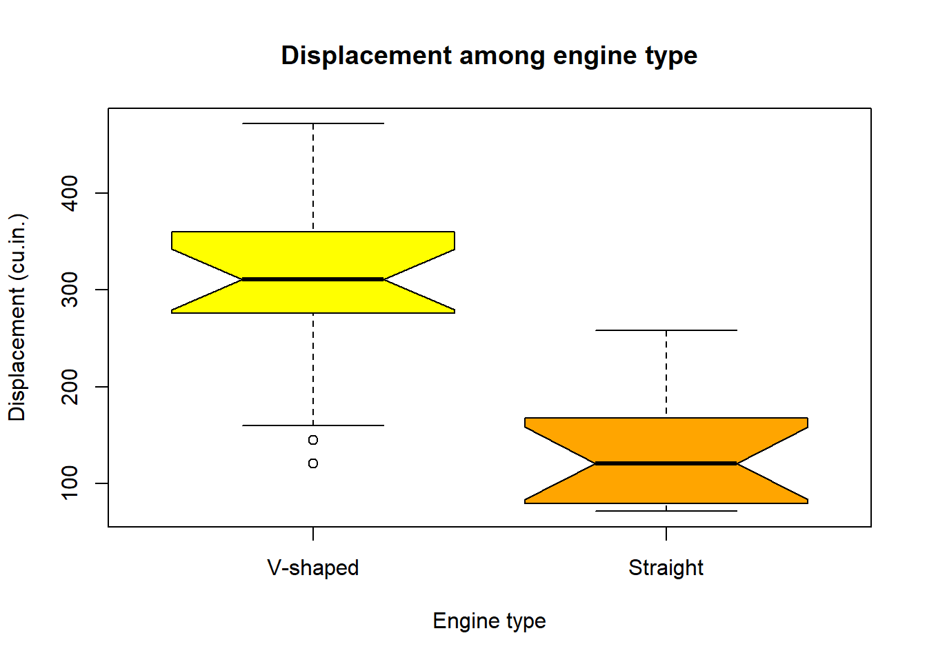 boxplot(mtcars$disp~mtcars$vs,main="Displacement among engine type", xlab = "Engine type", ylab ="Displacement (cu.in.)", col=c("yellow","orange"), names =c("V-shaped","Straight" ), notch = TRUE)