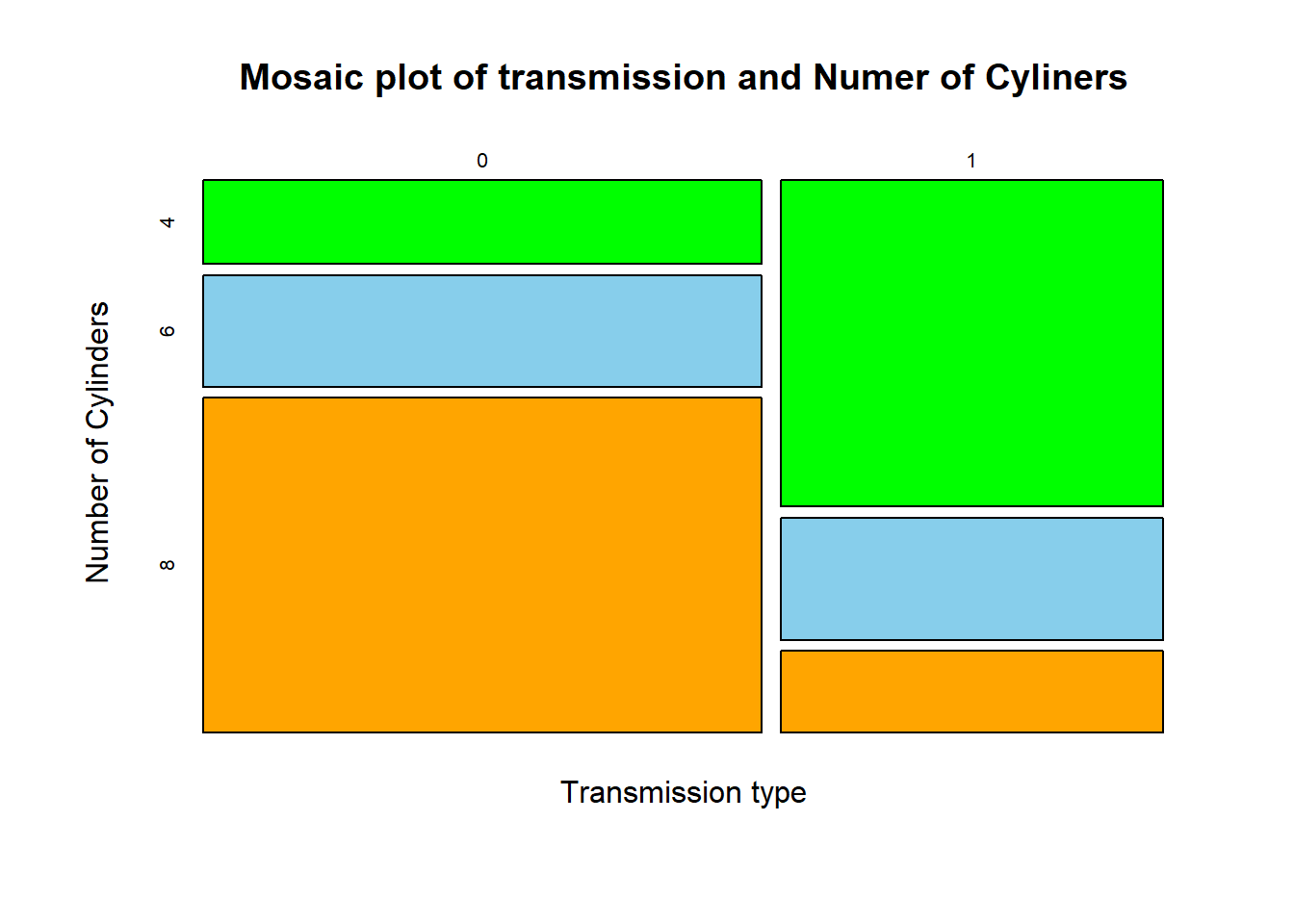 mosaicplot(counts2, xlab = "Transmission type", main = "Mosaic plot of transmission and Numer of Cyliners", ylab="Number of Cylinders", col =c("green", "skyblue","orange") )
