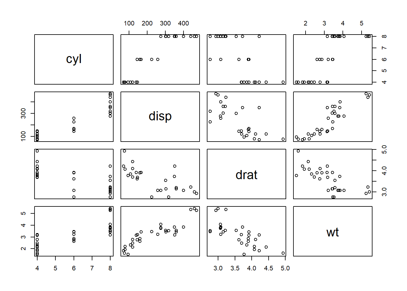 #pairs(~ mtcars$cyl+mtcars$disp+ mtcars$drat+ mtcars$wt)