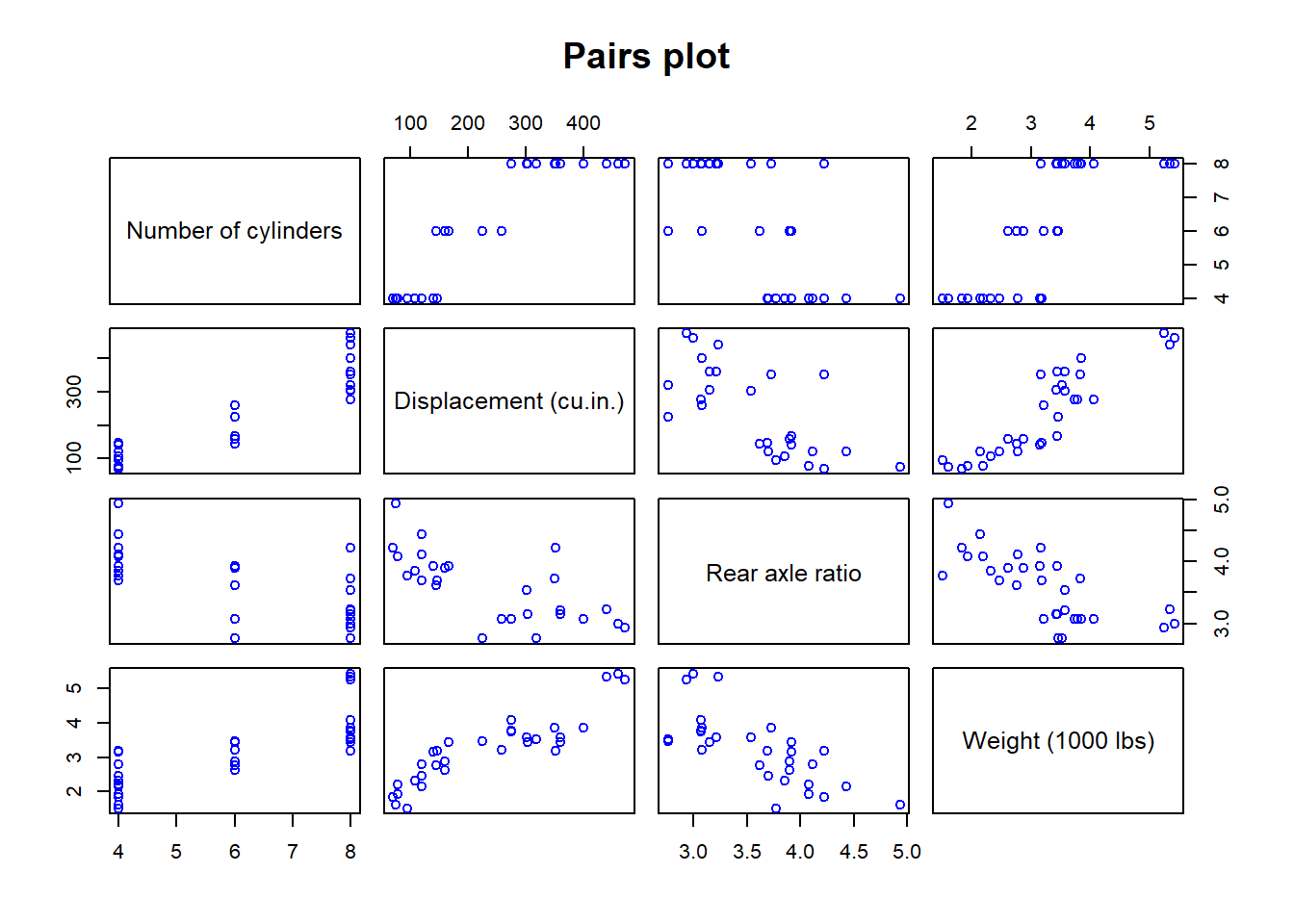 pairs(~ cyl + disp + drat + wt, data=mtcars, col="blue", main="Pairs plot",