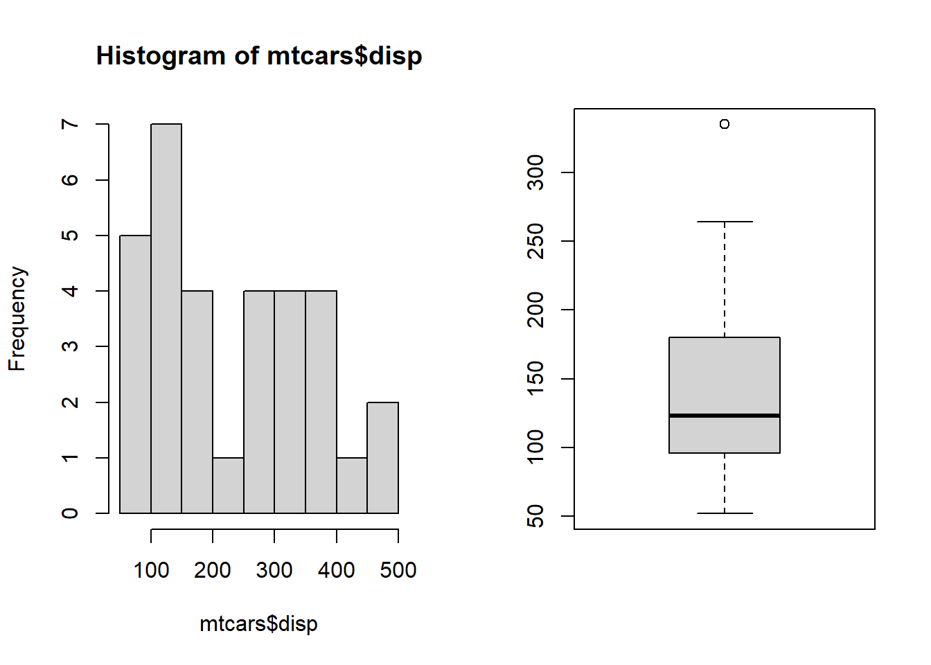 side-by-side boxplots Side-by-side boxplots are also useful for comparing multiple groups or categories. From our example, lets look at the distribution of disp Displacement (cu.in.) between type of engine (0 = V-shaped, 1 = straight)) as follows,