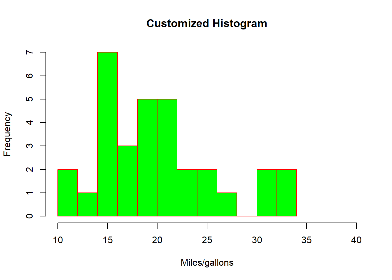 hist(mtcars$mpg, breaks =10, main = "Customized Histogram", xlab = "Miles/gallons", ylab= "Frequency", col = "green", border ="red", xlim = c(10,40) )
