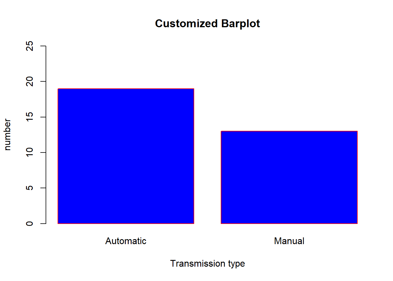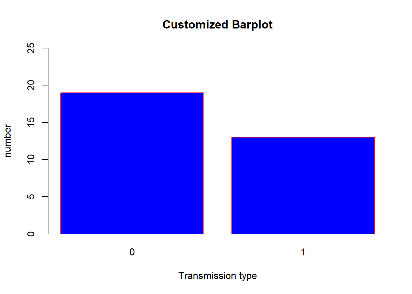barplot(counts, main = "Customized Barplot", xlab = "Transmission type", ylab= "number", col = "blue", border ="red", ylim = c(0,25), names.arg = c("Automatic", "Manual") )