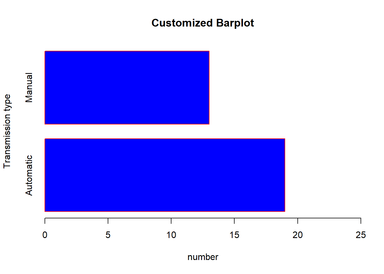 barplot(counts, main = "Customized Barplot", ylab = "Transmission type", xlab= "number", col = "blue", border ="red", xlim = c(0,25), names.arg = c("Automatic", "Manual"), horiz = TRUE)