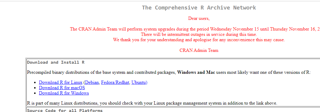 The version of R to download depends on what operating system you use. Below are the detailed installation instruction for windows and Mac OS X users. The process described here are based on the latest version available as of the time this note is being written.