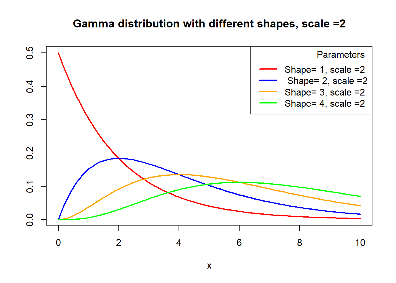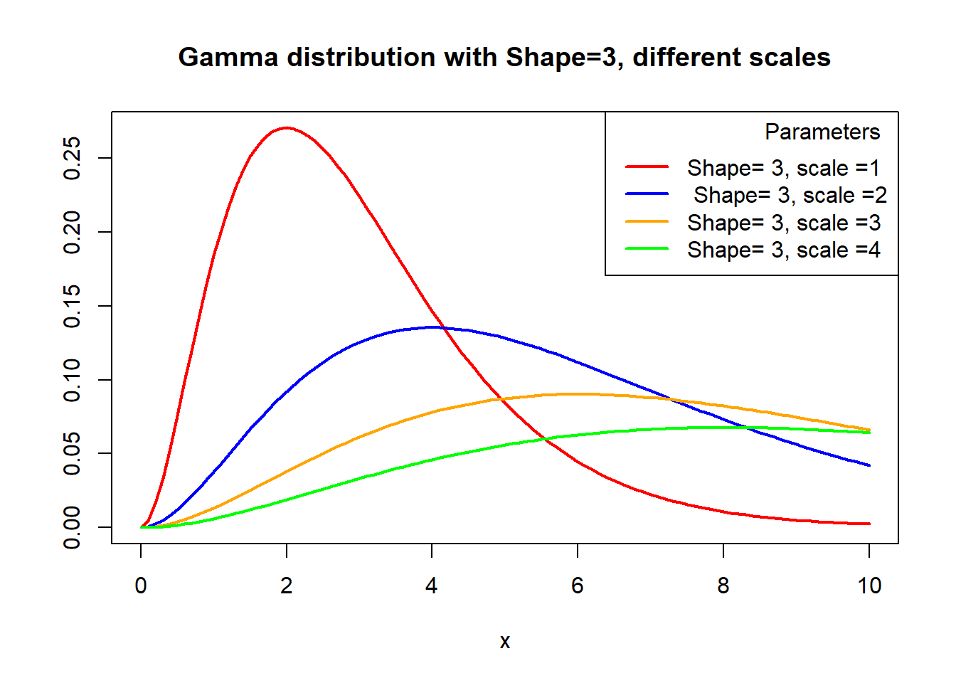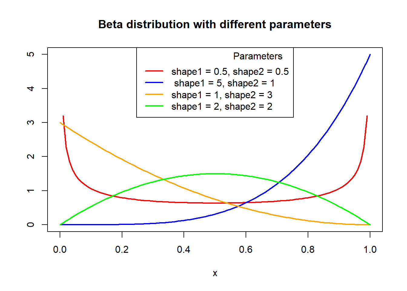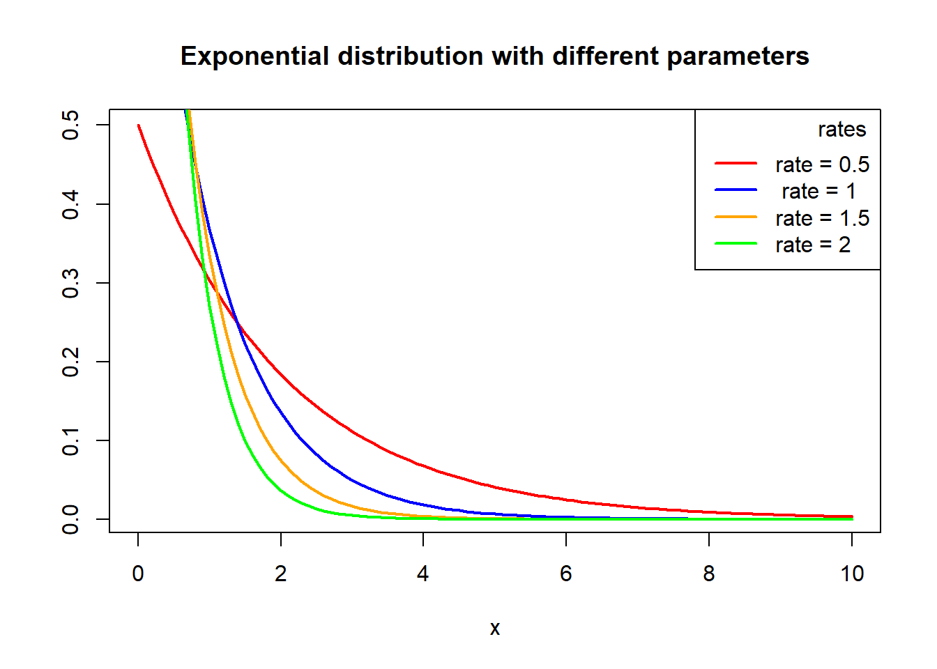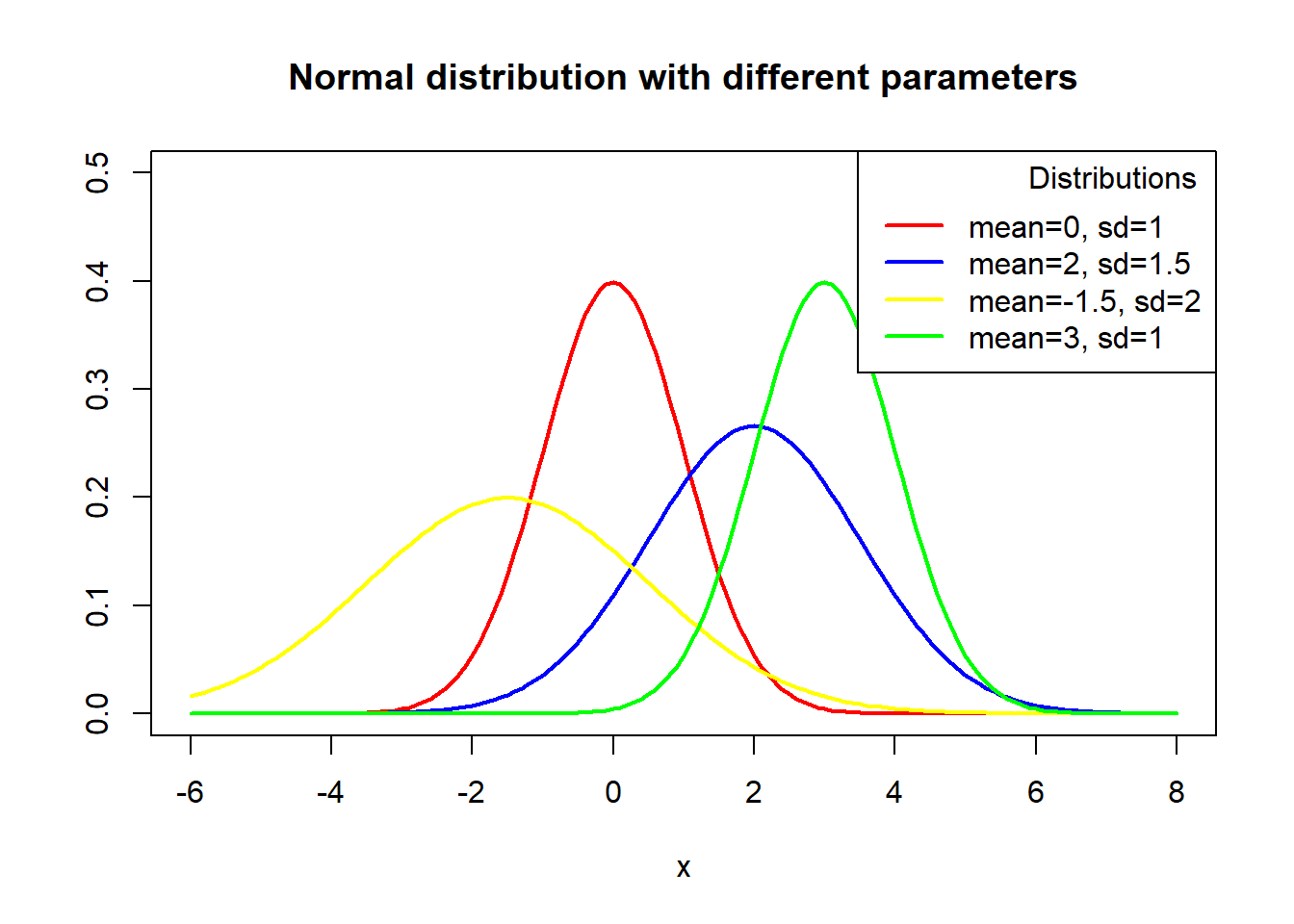 legend("topright", legend = c("mean=0, sd=1", "mean=2, sd=1.5", "mean=-1.5, sd=2", "mean=3, sd=1"), col = c("red", "blue", "yellow", "green"),