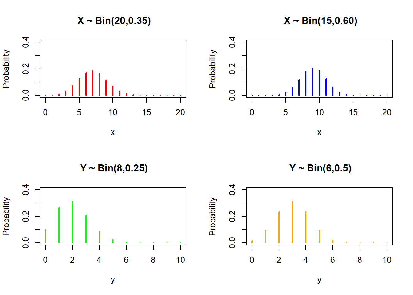 ylim = c(0, 0.4), ylab = "Probability", main = " Y ~ Bin(6,0.5)", lwd = 2, col = "orange")