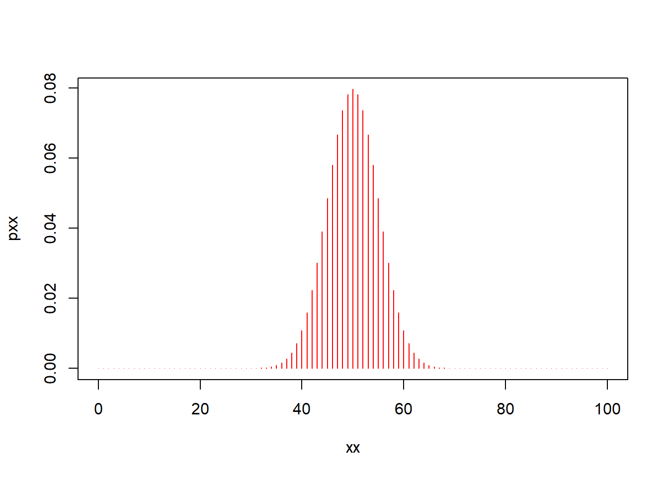 pxx<- dbinom(x=xx, size=100, prob=0.5)