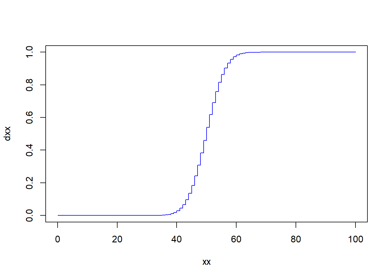 dxx<- pbinom(q=xx, size=100, prob=0.5)