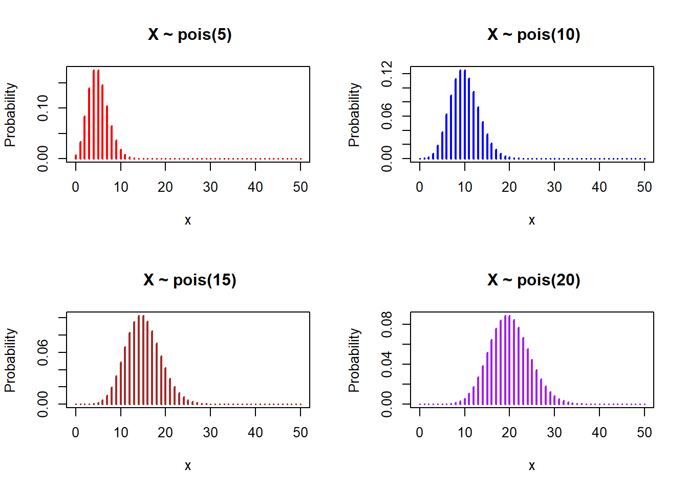 plot(x, dpois(x, 20), type="h", ylab = "Probability", main = " X ~ pois(20)", lwd = 2, col = "purple")