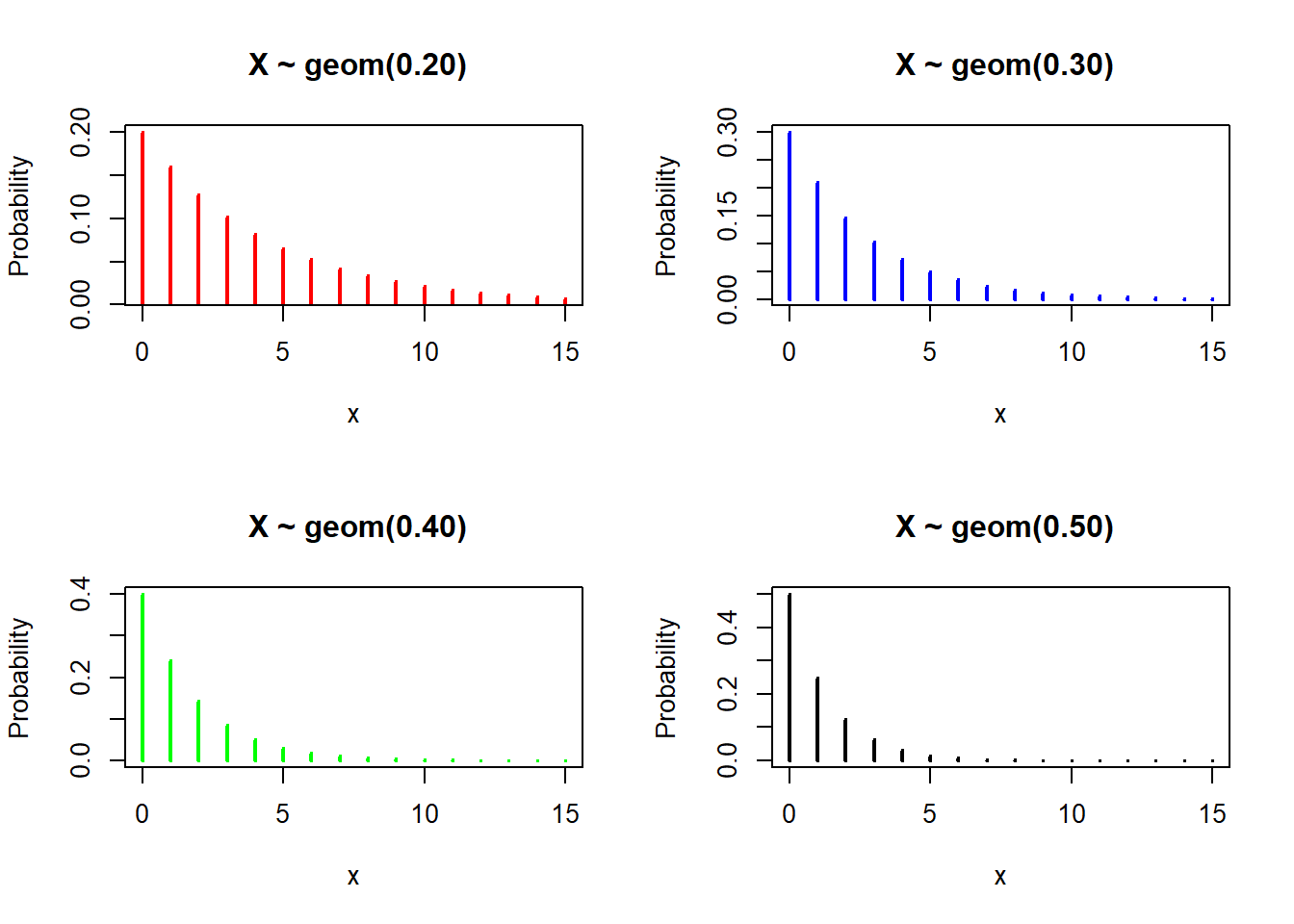 ylab = "Probability", main = " X ~ geom(0.40)", lwd = 2, col = "green")