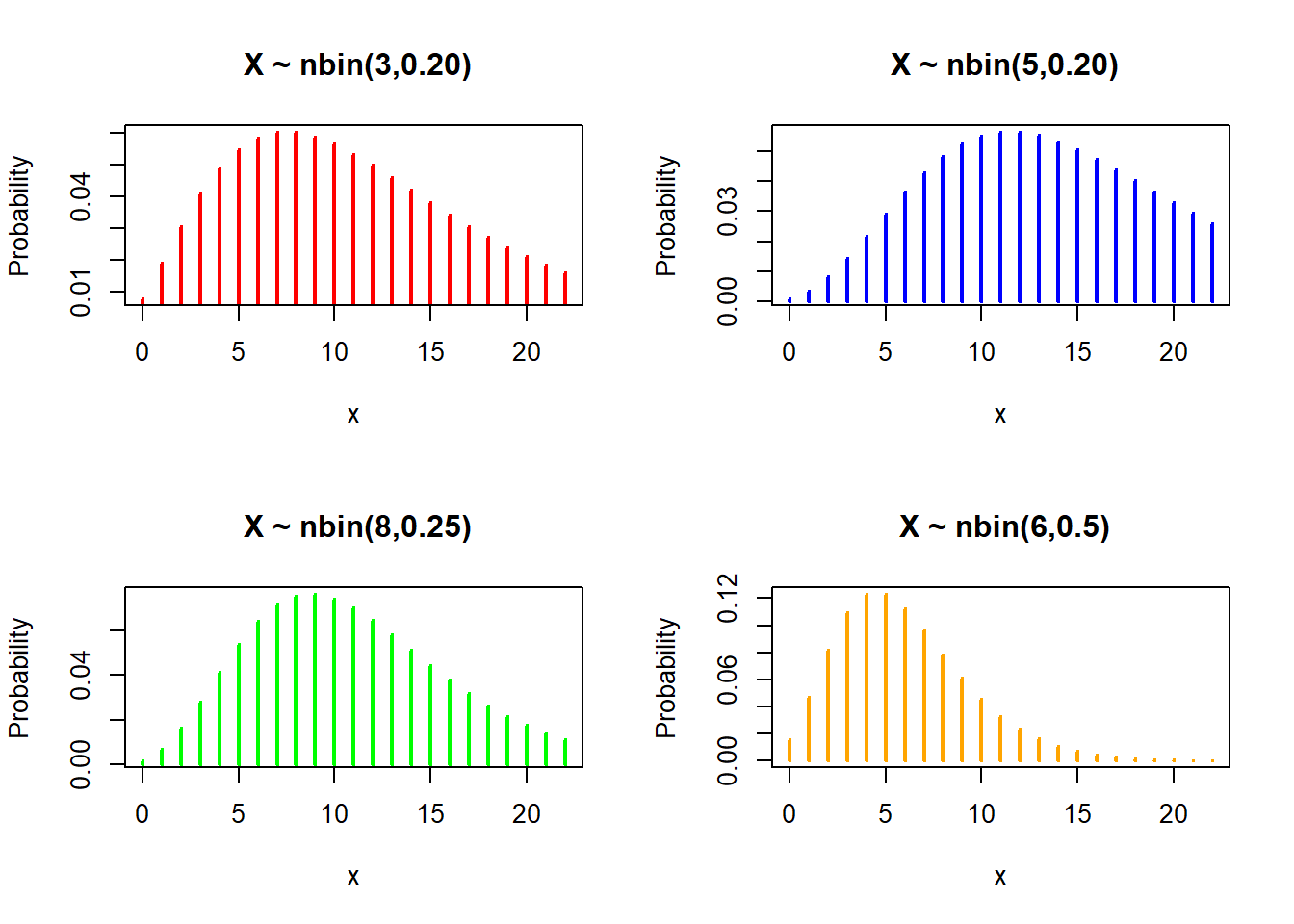 ylab = "Probability", main = " X ~ nbin(5,0.20)", lwd = 2, col = "blue")