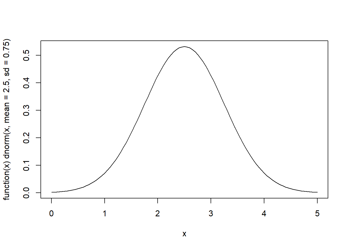 plot(function(x) dnorm(x, mean=2.5, sd=0.75), 0, 5)