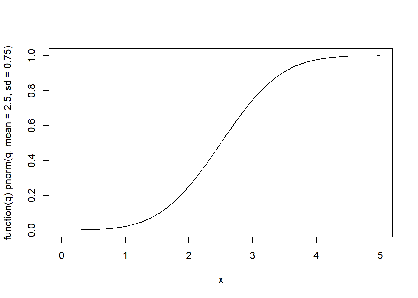 plot(function(q) pnorm(q, mean=2.5, sd=0.75), 0, 5)