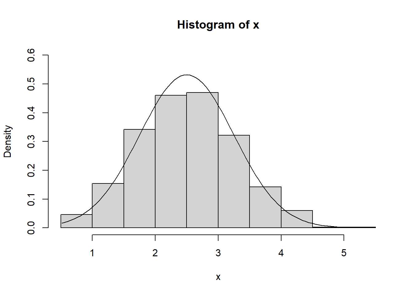 lines(xx, dnorm(xx, mean=2.5, sd=0.75))
