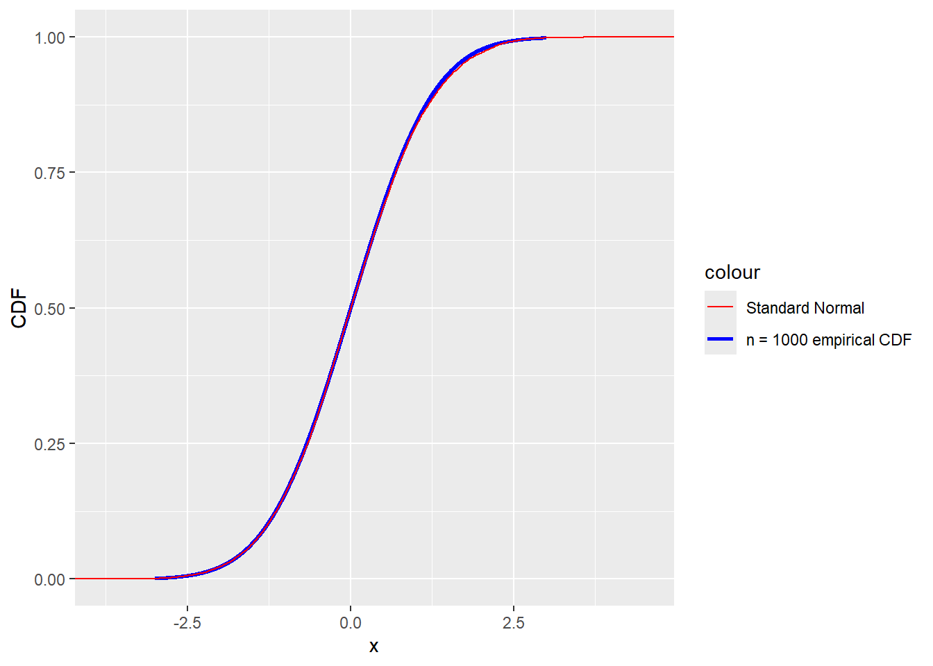 Comparing the empirical CDF obtained for \(n=1000\) with the CDF of the standard normal distribution yields the plot
